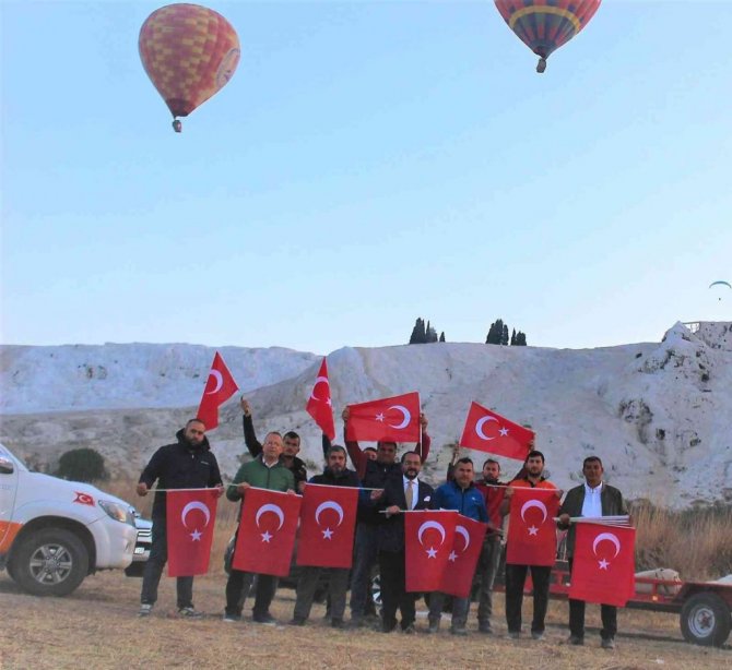 UNESCO'nun Dünya Miras Listesi'nde bulunan beyaz cennet Pamukkale'nin tüm güzelliği kırmızı beyaz renklerle süslenen balonla birlikte tekrar objektiflere yansıdı. Pamukkale semalarında gerçekleşen cumhuriyet yolculuğu, drone ile havadan da görüntülendi. MHP Pamukkale İlçe Başkanı Yılmaz tarafından daha sonra 500 adet bayrak dağıtıldı.