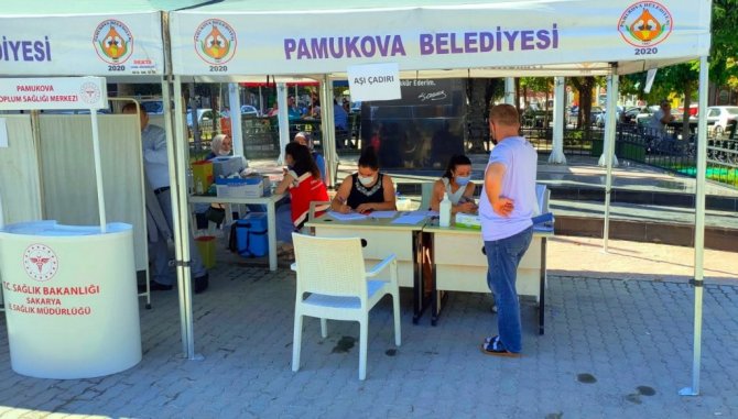 Pamukova Toplum Sağlığı Merkezi, korona virüs aşısının uygulanmasını hızlandırmak amacıyla vatandaşların aşıya daha rahat ulaşabilmesi için ilçe merkezinde aşı çadırı kurdu. Bu kapsamda Toplum Sağlığı Merkezi ekipleri tarafından, çadırda korona virüs aşıları yapılmaya başlandı. Çadır önünde yoğunluk oluşurken, Toplum Sağlık Merkezi filyasyon ve aşılama ekibi doktoru Merve Büşra Erdem, ilçe olarak aşılamada olumlu bir yol kat edildiğini söyleyerek, "Aşılanmada daha hızlı olmak için ve toplumun her kesimine ulaşmak için çadırları açtık. Fabrika gibi toplu çalışılan yerlerde aşılamaya devam ederek yerinde aşılama yapıyoruz. İlerleyen süreçte toplu çalışılan yerlerin tamamını aşılamış olmayı planlıyoruz. Korona virüse karşı en büyük silahımız aşı ve bu hastalığı aşıyla yenebiliriz. Bizlerin tek istediği vatandaşlarımızın aşılarını yaptırmaları" dedi.
