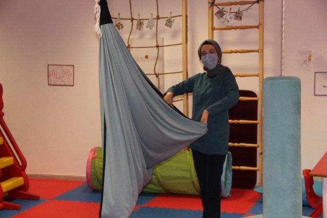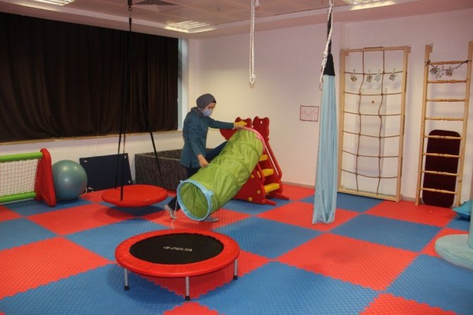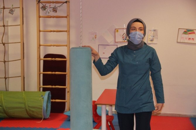 Ergoterapist Sedanur Gürlek, çocukların ihtiyacına göre program hazırladıklarını belirterek, "Buraya psikiyatri bölümüne başvuran çocuklar doktorlar tarafından yönlendiriliyorlar. Günlük yaşam becerilerinde, kendi günlük ihtiyaçlarını görmede sorun yaşayan çocuklarla burada rehabilitasyon programını yürütüyoruz. Çocuk yazı yazmada zorlanabilir, bağcığını bağlamada zorlanabilir veya duyusal problemleri olabilir. Çocuğun ihtiyacına göre programını belirleyip burada rehabilitasyon süreçlerini yürütüyoruz ergoterapi biriminde" dedi.
