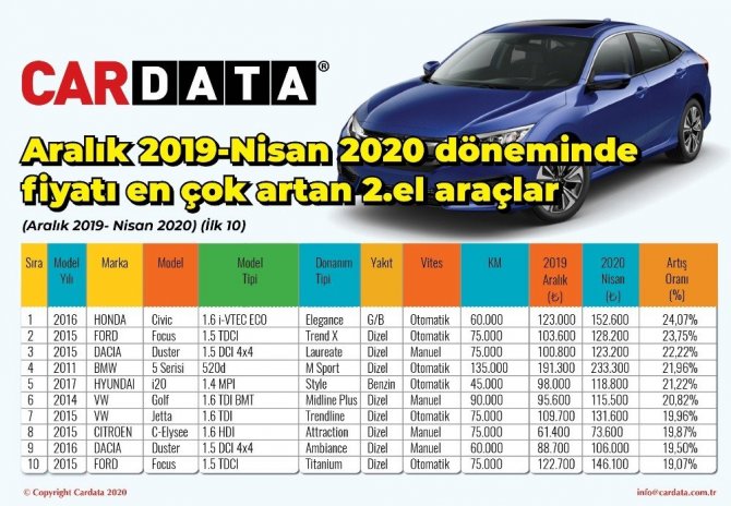 Salgın dönemini kapsayan Aralık-Nisan ayları arasında, fiyatı en çok artan ikinci el otomobil yüzde 24,07 ile 2016 model Honda Civic 1.6 i-VTEC Eco oldu. 2015 model yılı Ford Focus 1.5 TDCI, yüzde 23,75 fiyat artışıyla ikinci sırada gelirken, ikinci el değeri yüzde 22,22 artan 2015 model Dacia Duster 1.5 DCI 4x4 üçüncü sırada yer aldı. Bu modelleri, yüzde 21,96 fiyat artışıyla BMW 520d ve yüzde 21,22 artışla Hyundai i20 1.4 MPI takip etti.