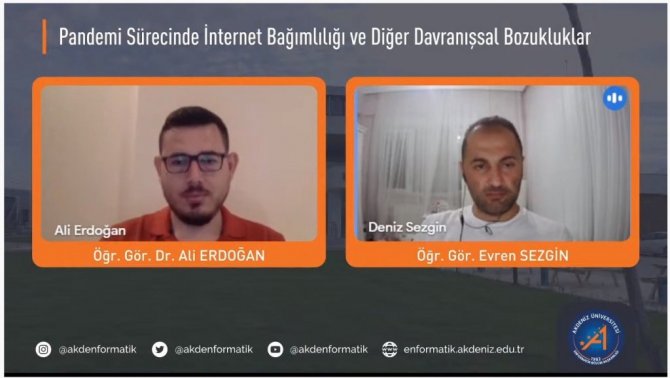 Akdeniz Üniversitesi Enformatik Bölüm Başkanlığı tarafından, Akdeniz Üniversitesi Tıp Fakültesi Ruh Sağlığı ve Hastalıkları Anabilim Dalından Öğr. Gör. Dr. Ali Erdoğan'ın konuk olduğu "Pandemi Sürecinde İnternet Bağımlılığı ve Diğer Davranışsal Bağımlılıklar" konulu çevrim içi etkinlik düzenlendi. Sosyal medya üzerinde canlı yayınlanan etkinliğin moderatörlüğünü Enformatik Bölüm Başkanlığı'ndan Öğr. Gör. Evren Sezgin gerçekleştirdi.