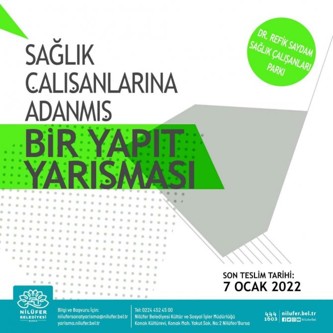 Korona virüs salgını döneminde hayatını kaybeden sağlık çalışanlarının anısını yaşatacak bir park yapılacağını duyuran Nilüfer Belediyesi, parka yerleştirilecek sağlık anıtı için bir yarışma düzenledi. Yarışmaya 7 Ocak 2022 tarihine kadar başvuru yapılabilecek.