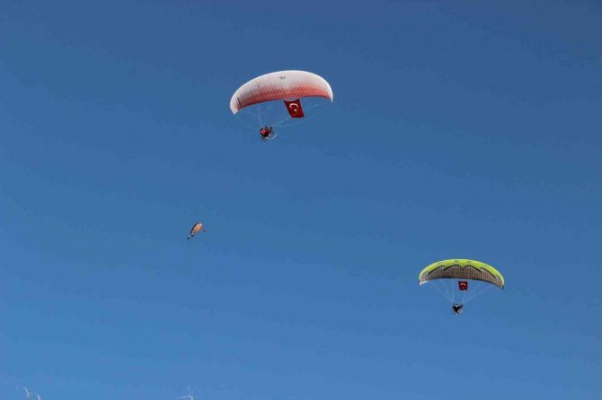 Manisa'da Cumhuriyet Bayramının 98. yılı coşku içinde kutlandı. Ellerine bayraklarını alan vatandaşlar resmi geçit törenini izlerken Manisa semalarında yamaç paraşütçüleri de açtıkları bayraklarla Manisalıları selamladı.