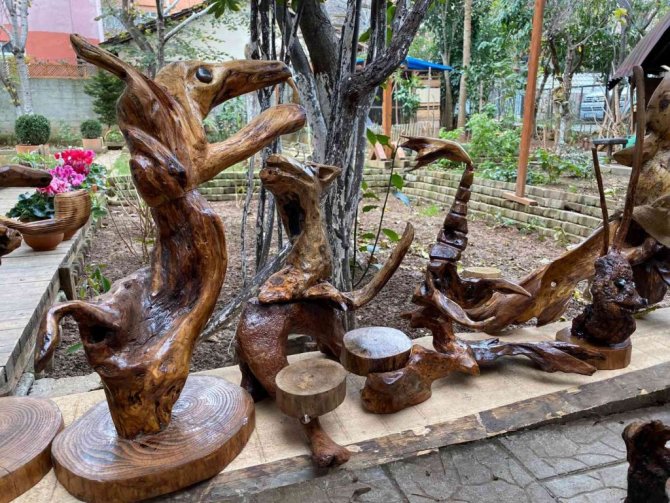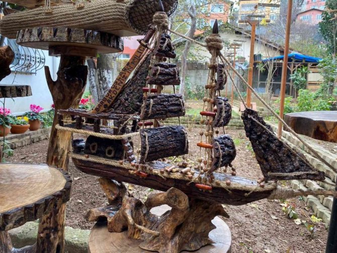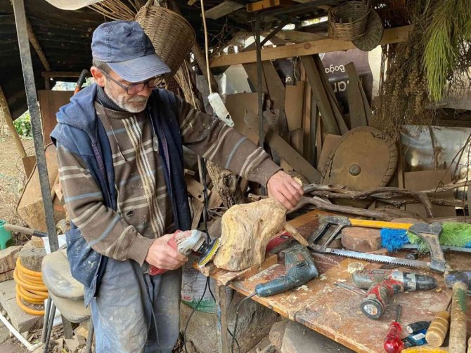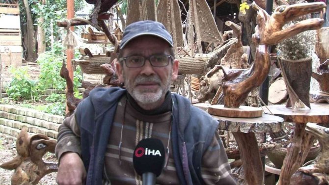 Ağaç oyma işine nasıl başladığını anlatan Mustafa Avcı, "Ben aşçıbaşıyım. Pandemiden dolayı işsiz kaldım. Bahçede ablama yardım ederken kendisi benden bir kuş evi yapmamı istemişti. Kendisine kuş evi yaptıktan sonra çocuklarıma da bir ev yapayım diye düşündüm. Yaptığım ev büyük bir çiftlik evi gibi bir ev oldu. Ondan sonra elimin yatkınlığının farkına vardım ve devam ettim. Hobi amaçlı başladım. Sonra çevremdeki insanların beğenisini görünce devam ettim ve ortaya bu yaptığım ürünler çıktı. Arkadaşlarım ve eşlerinin bahçelerinden söküp verdiği kök ve atık ağaçları değerlendiriyorum. Kendim de ormandan gidip atıkları, çürümüş dalları, kökleri toplayıp farklı objeler yapıyorum. Satış yapıyorum. Tezgah açıyorum" dedi.