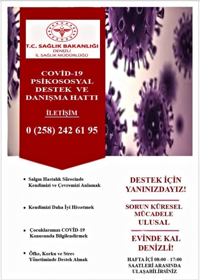 Mart ayında Denizli'de vakalarının görülmesinden itibaren Müdürlük bünyesinde vatandaşlara telefonla psikososyal destek sağlamak amacıyla "Korona virüs Psikososyal Destek ve Danışma Hattı" kuruldu. Gerek bu hattı arayarak psikososyal destek almak isteyen, gerekse Merkez ve İlçelerde bulunan İlçe Sağlık Müdürlükleri, Toplum Sağlığı Merkezleri ile Sağlıklı Hayat Merkezleri tarafından ulaşılan psikososyal desteğe ihtiyacı olan kişilere Çocuk Gelişimci-Psikolog-Sosyal Hizmet Uzmanları tarafından telefonla danışmanlık hizmeti verildi.
