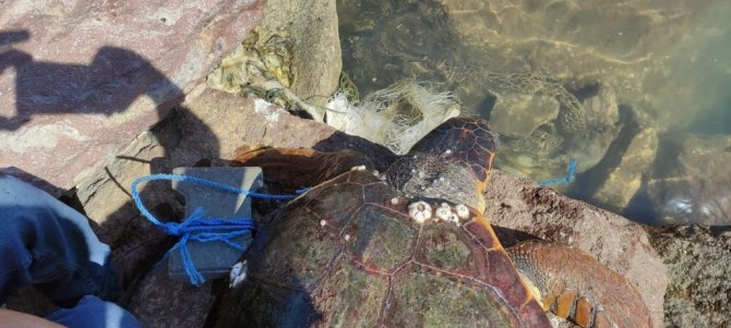 Parke taşı bağlanarak denize atılan Caretta Caretta kurtarıldı