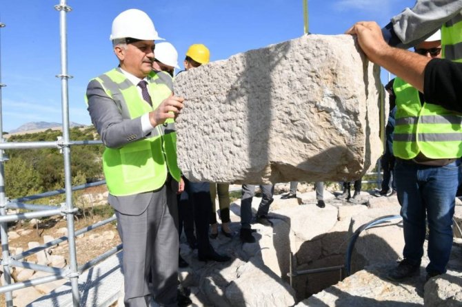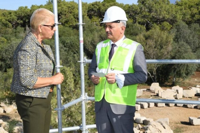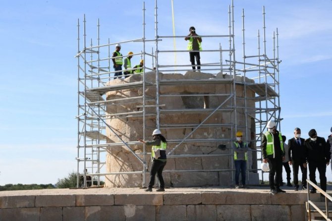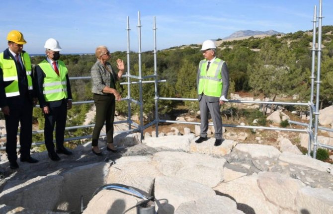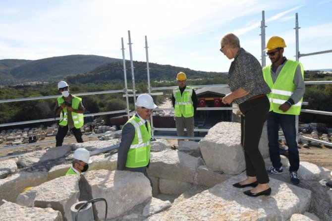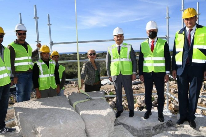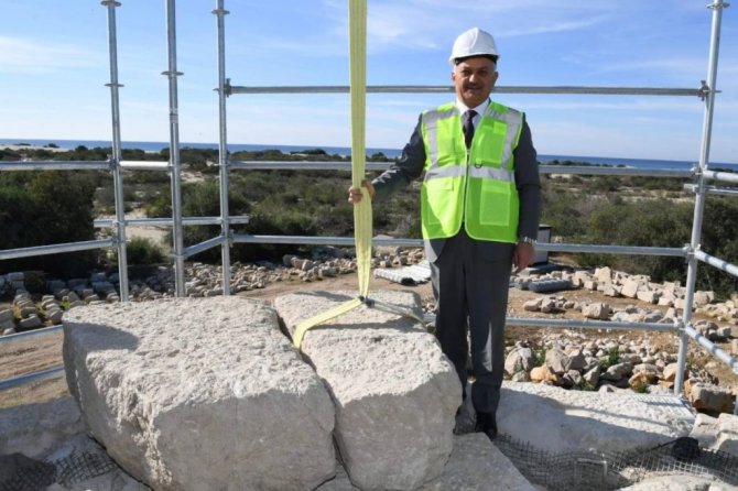 Restorasyon çalışmaları devam eden Patara Deniz Feneri'nin ilk kasnağın ilk taşını Vali Ersin Yazıcı koydu.