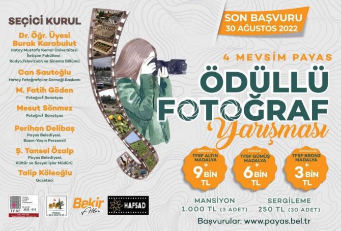 Türkiye Fotoğraf Sanatı Federasyonu iş birliği ile düzenlenecek "Payas'ta Dört Mevsim" konulu ulusal fotoğraf yarışmasında Payas'ın doğal güzellikleri, tarihi mekanları, turistik, sosyal ve kültürel öğelerinin vurgulanacağı kapsayıcı fotoğraflar yarışacak. Yarışmada birinci olana altın madalya ve 9 bin lira para ödülü, ikinciye gümüş madalya ve 6 bin lira para ödülü, üçüncüye ise bronz madalya ve 3 bin lira para ödülü verilecek. Başvurular arasından ayrıca 3 kişiye de mansiyon ödülü verilecek.