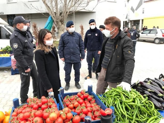İlçede sosyal hayatta önemli yer tutan halk pazarında sıkı denetim yapıldığını belirten Kaymakam Armağan Yazıcı, "Pazar yerimizin ana girişlerini araç girişlerine kapatarak, vatandaşlarımızın sosyal mesafe alanlarının daraltılmasının önüne geçilmeye çalışıldı. Pazara gelen vatandaşlarımıza ve esnafımıza salgın konusunda uymaları gereken; maske, mesafe ve hijyen kuralları hatırlatıldı. Görevlendirilen kolluk kuvvetlerimizle; pazar esnafı ve vatandaşlarımızın kurallara uyup uyulmadığının denetimi, kalabalık oluşturabilecek ve pazar alanı içerisinde bulunan kafe, lokal ve kıraathanelerin sürekli denetimi gerçekleştirildi. Denetimlerimiz aralıksız olarak devam edecek" ifadelerini kullandı.