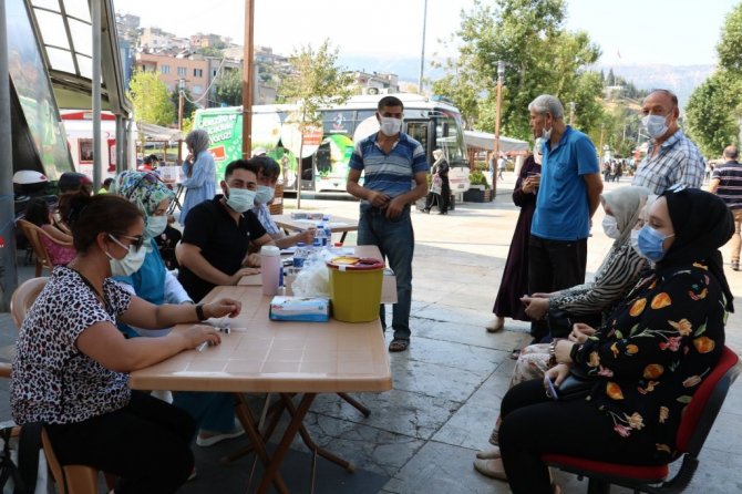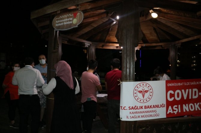 Kahramanmaraş'ta sağlık çalışanları tarafından il genelinde aşı kampanyası gece ve gündüz sürdürülürken, vatandaşlar park ve bahçelerin yanı sıra sokak ve meydanlarda kurulan stantlarda aşılarını randevusuz olabiliyor.