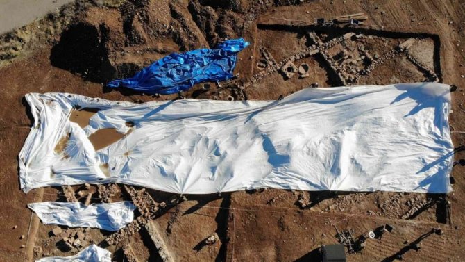 Son yapılan kazılarda dokuma tezgahı bulunan Adıyaman'daki Perre Antik Kent'te kazı alanının üzeri kış şartlarında zarar görmesin diye branda ile kapatılıyor.