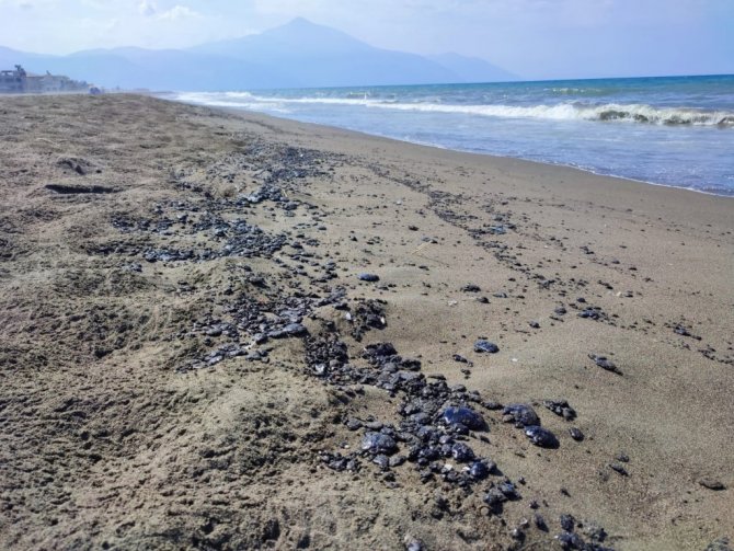 Hatay'ın Samandağ ilçesinde sahile vuran petrol atıkları, Hatay Büyükşehir Belediyesi ve Sahil Güvenlik ekipleri tarafından temizlendi.