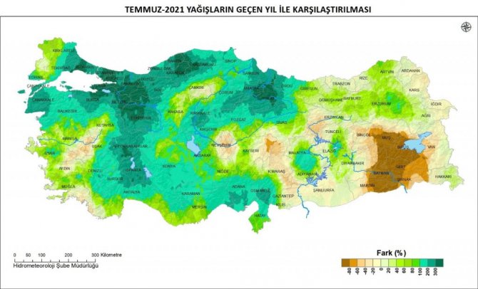 "Türkiye geneli temmuz ayı yağışları normaline göre artma gösterdi. Temmuz ayı yağışı 19.0 mm, normali (1981-2010) 16.4 mm ve 2020 yılı temmuz ayı yağışı 14.1 mm'dir. Yağışlarda normaline göre yüzde 16, geçen yıl temmuz ayı yağışlarına göre yüzde 35 artma kaydedildi. Bölge geneli yağışlarda ise Marmara, Ege, Akdeniz ve İç Anadolu bölgeleri normallerinin altında yağış aldı. Yağışlar Batı Trakya, İzmir, Balıkesir, Kuşadası, Marmaris, Kemer, Silifke, Anamur, Ankara'nın güneyi, Nevşehir, Hatay, Gaziantep, Şanlıurfa çevreleri ile Van Gölü'nün batı, Güneydoğu Anadolu Bölgesi'nin doğu kesimlerinde normallerine göre yüzde 80'den fazla azalma gösterirken, Çanakkale, Sakarya, Düzce, Tunceli çevreleri ile Doğu Karadeniz Bölgesi normalinin iki katından fazla yağış aldı. Temmuz ayı il geneli yağışlarda en fazla yağış 235 mm ile Rize'de, en az yağış 1 mm ile Şırnak, Hatay ve Siirt'te kaydedilirken, normaline göre en fazla azalma yüzde 89 ile Hatay ve yüzde 88 ile Edirne'de gerçekleşti. Yağışlı gün sayılarının Ege, Batı Trakya, Akdeniz Bölgesi sahil kesimi, İç Anadolu'nun iç kesimleri ile Güneydoğu Anadolu Bölgelerinde yer yer 1 güne kadar düştüğü, Kars ve Ardahan çevrelerinde ise 20 günün üzerine çıktığı gözlendi."