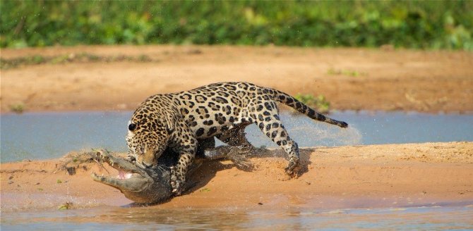 Araştırmacı profesörü en çok tatmin eden fotoğrafı olan jaguarın timsahı avladığı sahne serginin de yıldızı. Öztürk, jaguar fotoğrafı çekmek için Brezilya Pantanal’a yaptığı zorlu seyahati şöyle dile getirdi: "Buradan kalkıp saatlerce süren uçuşla Brezilya’ya gittim. Brezilya içinde 4-5 saat daha seyahat ederek Pantanal’a ulaştım. Güzel bir söz var ‘Şans ancak hazırlıklı olanları yakalar.’ Jaguar fotoğrafı çekmek çok zor aslında. Ormanın derinliklerinde yaşıyor ve görülmesi mümkün olan tek zaman Ağustos ve Ekim ayları arası. Jaguarlar bu kurak zamanlarda su içmek için nehir kenarlarına geliyor. Tek şansınız bu. Bana ise büyük bir ödülle av sahnesi yakalamak nasip oldu. Mizansen yapsak her şeyi bu kadar güzel ayarlayamazdık. En güzel ışık, en güzel arka plan, en güzel saat hepsi bir araya geldi ve jaguarın timsahı avladığı sahneyi bu şekilde fotoğrafladım".