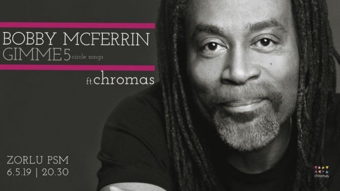 Bobby McFerrin sahnede; dört oktavlık vokal genişliği, eşsiz kelime haznesi ve bedenini kullanarak icat ettiği stiliyle cazdan popa, klasikten Afrika ezgilerine, dünya müziklerini barındıran sürprizlerle dolu bir performans sergileyecek. “Circlesongs” konseptiyle; tamamı insan sesiyle, anlık ve canlı olarak üretilen ezgi ve ritimlerden oluşan benzersiz müziğiyle McFerrin, Gimme5 ve Chromas ile birlikte dinleyicilere unutulmayacak bir gece yaşatacak.