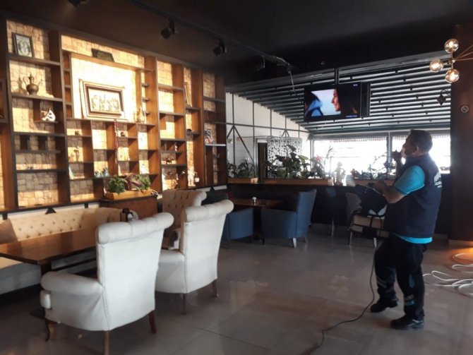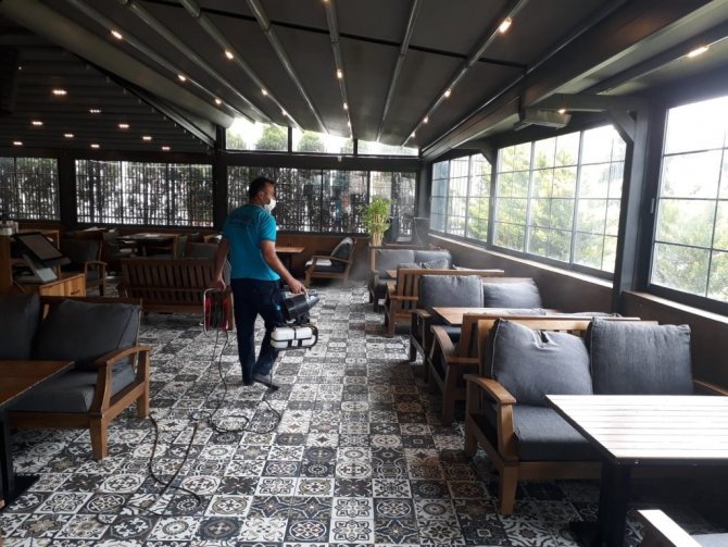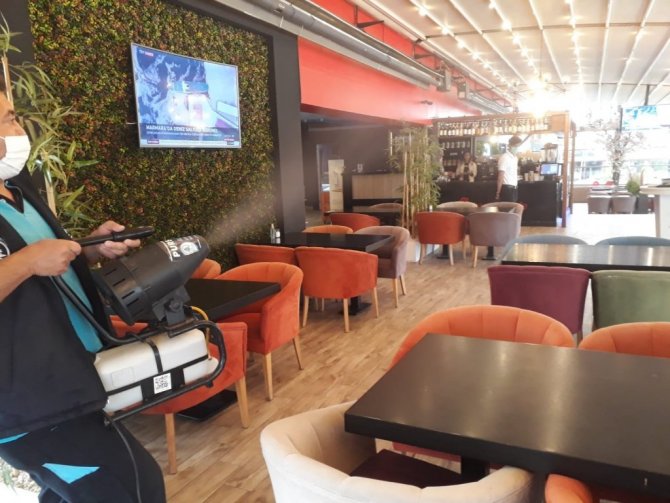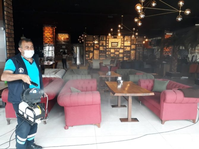 Vatandaşların hijyenik ve sağlıklı bir ortam hizmet alabilmeleri için çalışmalarını yürüten Belediye ekipleri, belirlenen kurallar çerçevesinde yeniden müşterilerini ağırlamaya başlayan kafe, restoran, kıraathane ve kahvehane gibi mekanlarda dezenfeksiyon işlemi gerçekleştirerek steril hale getirdi.