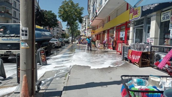 Pursaklar Belediyesi Temizlik İşleri Müdürlüğü ekipleri, vatandaşların sağlığı ve çevre temizliği kapsamında, gün içinde yoğunluk olduğu alanlar başta olmak üzere ilçe genelindeki yolları ve kaldırımları, detaylıca temizleyip, köpüklü suyla yıkıyor. Belediye ekipleri mesai mefhumu gözetmeksizin, temizlik ve dezenfeksiyon çalışmalarına ara vermeden devam ediyor. Kirlenen yol ve kaldırımları yıkayan ekipler, basınçlı su ile ilçe sakinlerine daha temiz ve sağlıklı bir ortam sunabilmek için büyük çaba sarf ediyor.