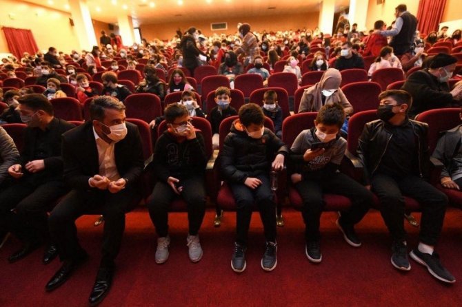 Ara tatillerini hem eğlenceli hem de öğretici bir şekilde geçirmek amacıyla tiyatroya koşan çocuklar, Başkan Ertuğrul Çetin'e yoğun ilgi göstererek fotoğraf çektirdi.