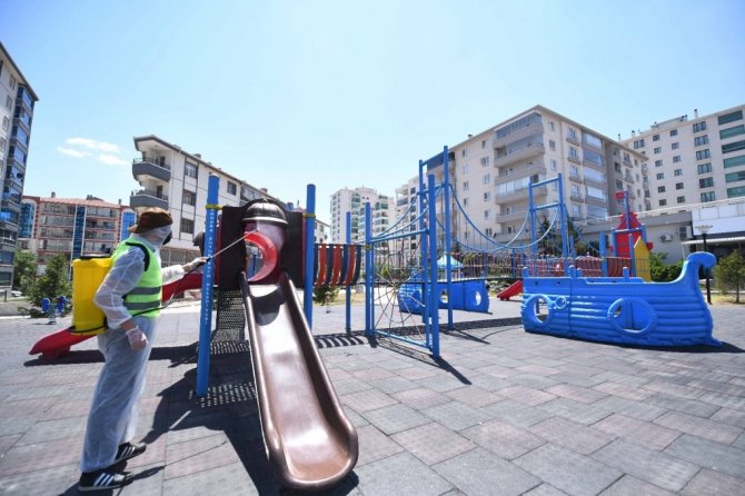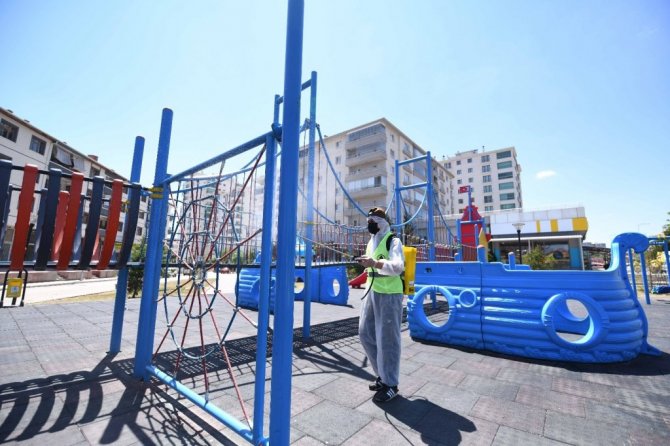 Pursaklar Belediyesi, virüsün yayılmaması adına verilen mücadelede ilçede bulunan parkları dezenfekte ederek sağlık koşullarına uygun hale getiriyor.