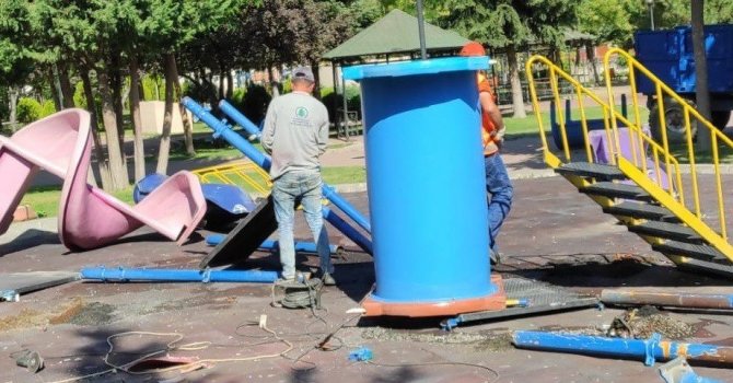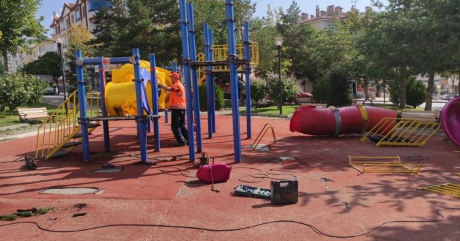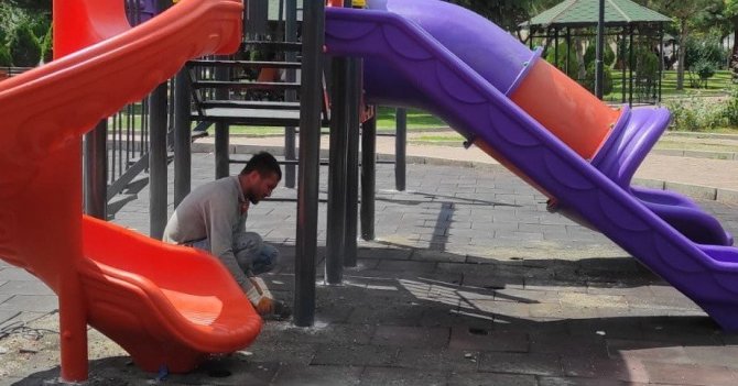 Pursaklar Belediyesi Park ve Bahçeler Müdürlüğü ekipleri, ilçe genelinde kırılan ya da deforme olan oyun gruplarının tadilatını yaparak yenileriyle değiştiriyor.