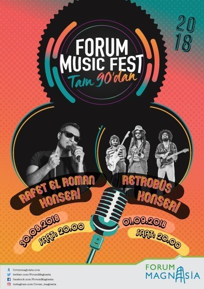 Forum Magnesia Alışveriş Merkezi bu yıl 30 Ağustos’ta hem Zafer Bayramı kutlaması hem de Forum Music Fest 90’lar etkinliği kapsamında Rafet El Roman ve Retrobüs’ü Manisalılarla buluşturacak. Forum Music Fest 90’lar isimli bu özel organizasyon kapsamında 30 Ağustos 2018 Perşembe günü saat 20.00’de ünlü sanatçı Rafet El Roman şarkılarını Manisalı hayranları için seslendirecek. 1 Eylül 2018 Cumartesi günü ise sevilen grup Retrobüs, Forum Music Fest 90’lar sahnesinde keyifli bir performans sergileyecek.