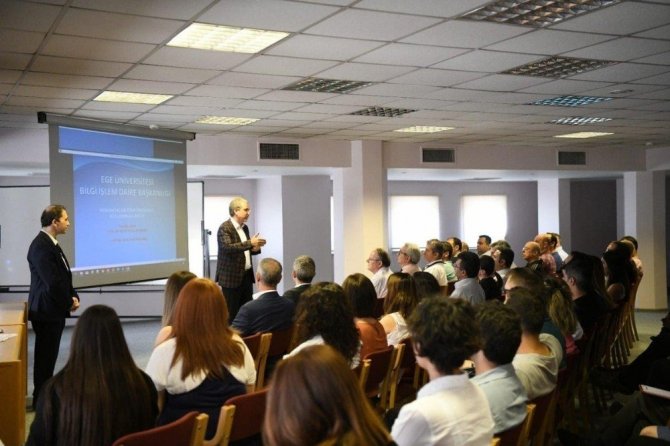Uygulamaya konan dijitalleşme süreçleri ile ilgili bilgi veren EÜ Bilgi İşlem Daire Başkanı Vekil Doktor Öğretim Üyesi Cihat Okan Arıkan, “Ege Üniversitesinin web sayfası yeniden düzenlenerek, çağdaş ve etkin bir görünüme kavuşturuldu. Sayfa, mobil cihazlarla da uyumlu hale getirildi; ayrıca tüm birimlerin web sayfalarının da aynı yapıda ve aynı temel görünüm özelliklerini kullanarak Ege Üniversitesi benliğini vurgulayacak hale getirilmesi çalışmalarına başlandı. Network yenileme çalışmaları kapsamında Ege Üniversitesi Ana ve Hastane Kampüsünde tüm birimlerde kablosuz internet bağlantı noktası sayıları artırıldı. Kampüs içerisindeki 8 ana toplama noktası ile internet çıkış noktası olan UBE binası arasındaki tüm bağlantılar 10G hızına çıkartıldı. Ayrıca tüm birimlerde bina içerisindeki ana cihazların tümü en az 1G hızında çalışacak hale getirildi. Üniversite internet çıkış hızı ULAKNET üzerinden 2.2 Gbit hızında olup daha da hızlanması için çalışmalar sürdürülüyor" diye konuştu.