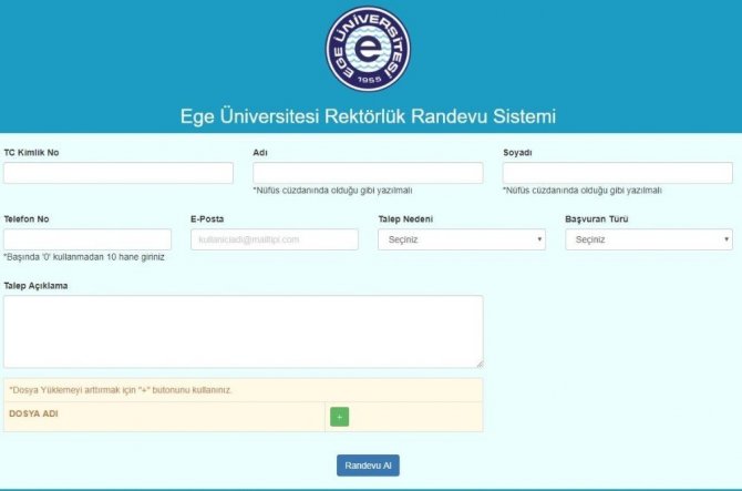 Ege Üniversitesi (EÜ) Rektörlüğü; tüm akademik, idari çalışan ve öğrenciler ile Ege Üniversitesi Rektörüne ulaşmak isteyen vatandaşlara yönelik yeni bir hizmeti daha hayata geçirdi. Ege Üniversitesinde iletişime açık bir kültür oluşturma hedefi çerçevesinde, şeffaf ve ulaşılabilir yöneticilik anlayışı ile “Rektör Randevu Talep Sistemi” hizmete sunuldu. Sistem ile çalışanından öğrencisine herkes, telefon yerine internet üzerinden hızlı ve güvenli bir biçimde, 7/24 rektörden, doğrudan randevu talep edebilecek.