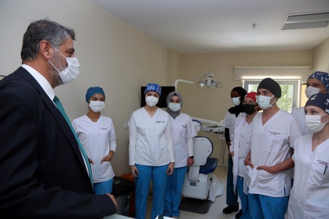 Rektör Polat burada teorik eğitimlerini tamamlayarak uygulama eğitimine devam eden Diş Hekimliği Bölümü öğrencileriyle de bir araya geldi.