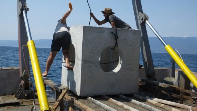 Burhaniye ilçesinde sun'i resiflerin Edremit Körfezine atılmasına başlandı.
