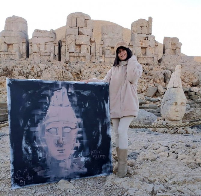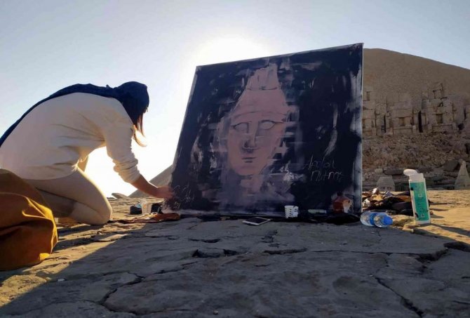 Türkiye'nin değişik şehirlerinde canlı performans sergileyen ressam Fatma Öztürk, bu kez tercihini Nemrut Dağı'ndan yana kullandı. Bulgaristan ve İtalya'da sergilere katılan sanatçı 2 bin 206 metre yükseklikte tuval üzerine akrilik boya ile Apollo'yu çizdi. Yaklaşık 2 saatlik bir çalışmanın ardından eseri ile sanatçı zirvede poz verdi.