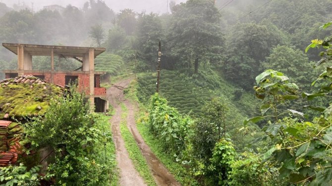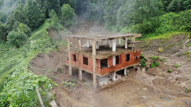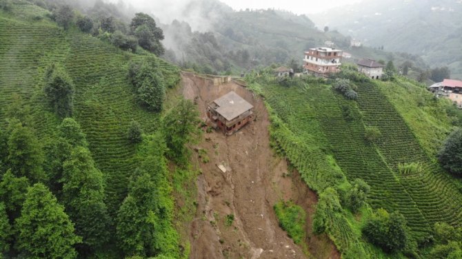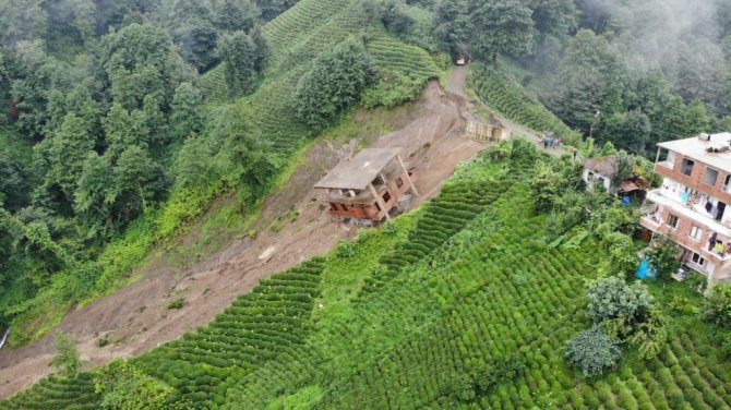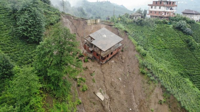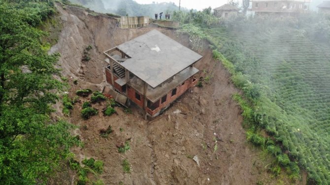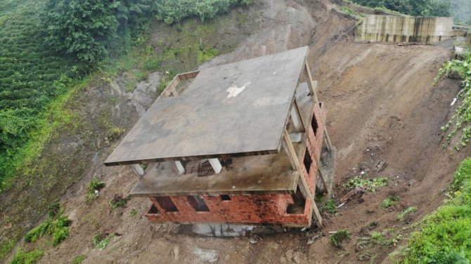 Rize'de şiddetli yağış sonrası Çayeli ilçesi Esendağ köyünde yaşanan heyelanda 3 katlı bina altındaki toprak ile birlikte sürüklenerek yan yattı.