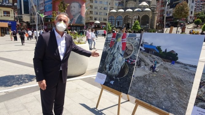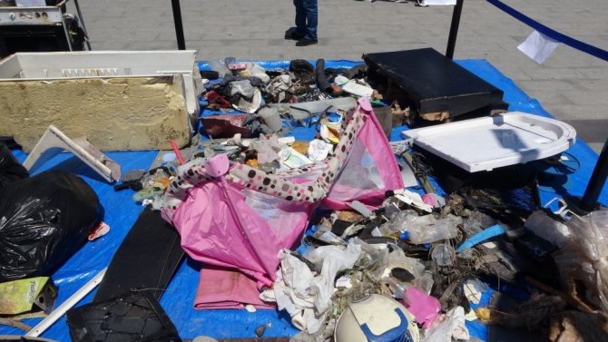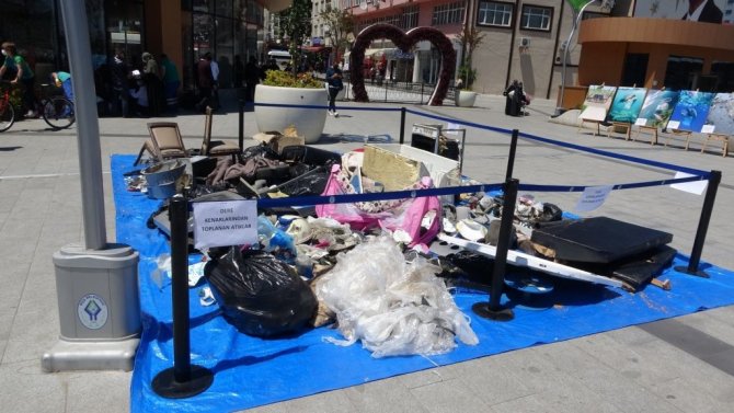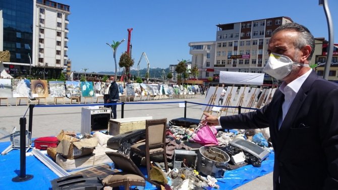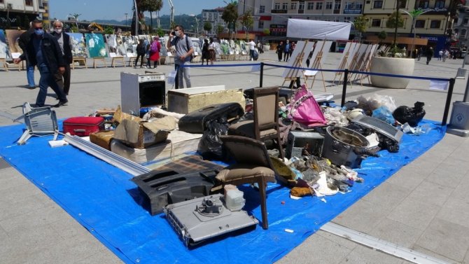 Rize'de dere yataklarından çıkan çöplerin bir kısmı Rize Meydanı'nda sergilendi.