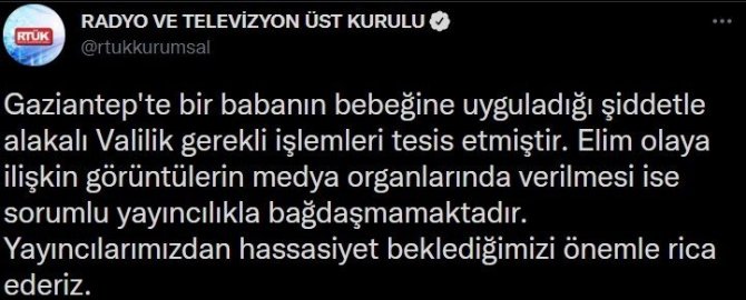 Radyo ve Televizyon Üst Kurulu'nun sosyal medya hesabından yapılan paylaşımda, "Gaziantep'te bir babanın bebeğine uyguladığı şiddetle alakalı Valilik gerekli işlemleri tesis etmiştir. Elim olaya ilişkin görüntülerin medya organlarında verilmesi ise sorumlu yayıncılıkla bağdaşmamaktadır. Yayıncılarımızdan hassasiyet beklediğimizi önemle rica ederiz" ifadeleri kullanıldı. Bunun üzerine RTÜK Başkanı Ebubekir Şahin, söz konusu paylaşımı alıntılayarak, "Toplumsal değerlerimizi derinden yaralayan olaylara karşı özellikle yayın organlarımızın daha hassas olmasını bekliyoruz. İlgili Valilik ve adli mercilerin gereğini yapacağından şüphemiz yok" dedi.