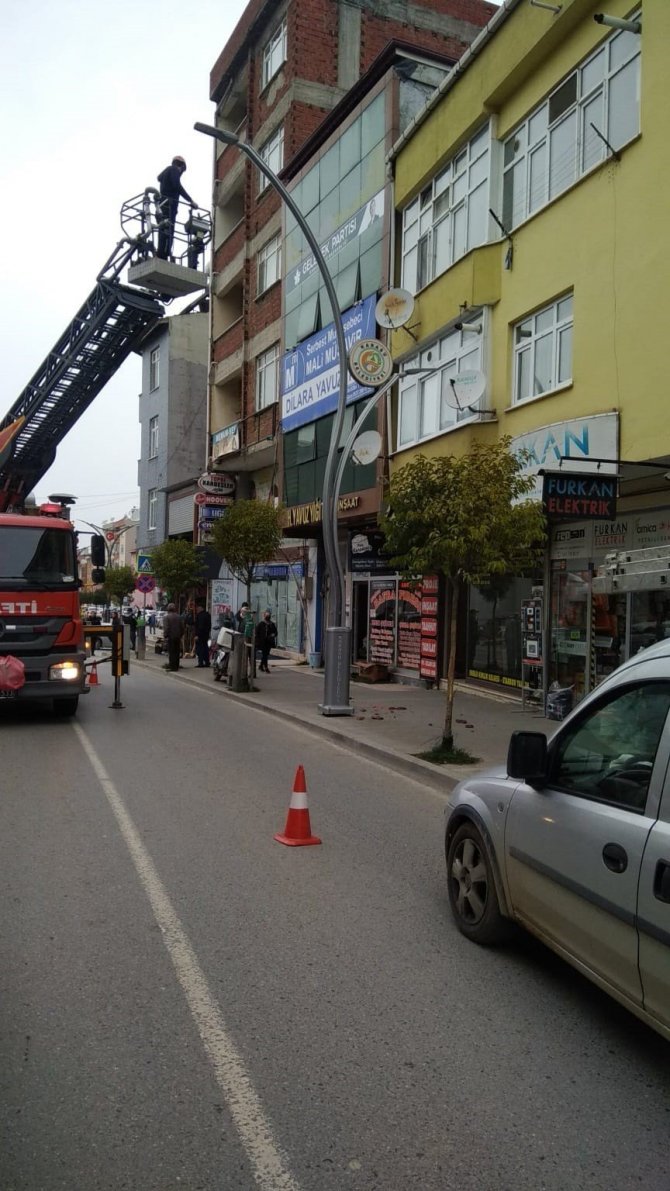 Sakarya'nın Karasu ilçesinde etkisini artıran rüzgar ile birlikte iki katlı binanın çatısında bulunan kiremitler yola düştü.