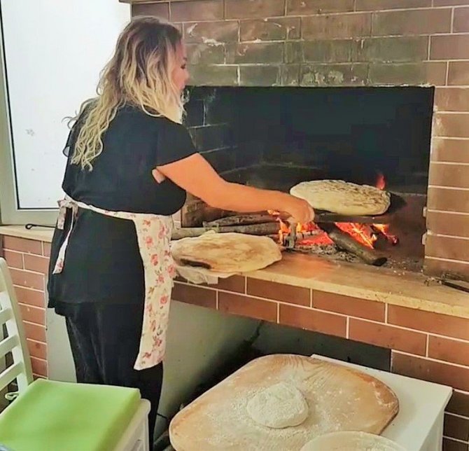 Safiye Soyman hamur açıp ekmek pişirdi