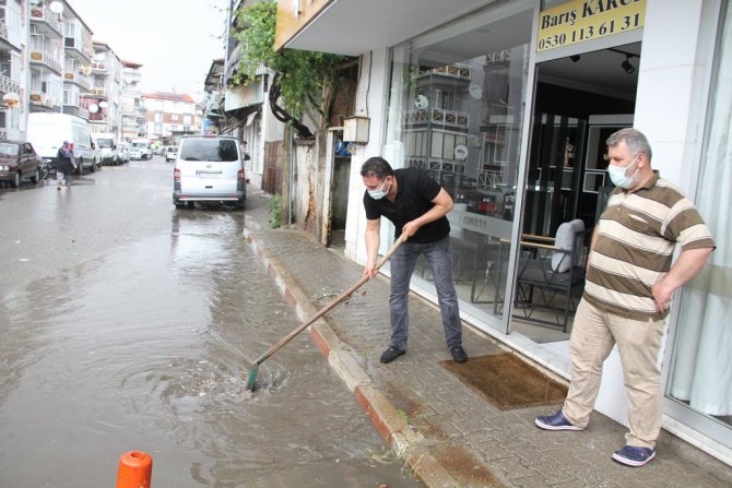 Manisa'nın Kula ilçesinde öğle saatlerinde aniden bastıran sağanak yağış hayatı olumsuz etkiledi. İlçenin bazı sokakları göle dönerken, esnaf ve vatandaşlar ev ve iş yerlerini su basmaması için sokak üzerindeki mazgalları kendi imkanları ile temizledi.