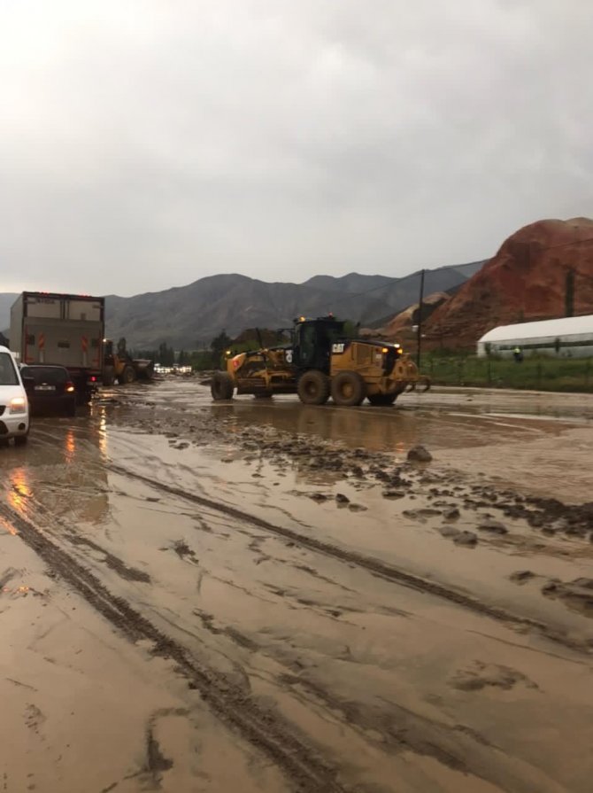 Erzurum'un Oltu ilçesinde akşam saatlerinde başlayan ve yaklaşık 15 dakika süren sağanakta Oltu-Erzurum karayolu bir süreliğine ulaşıma kapandı.