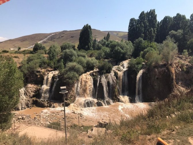 Van'ın Muradiye ilçesinde 2 günden buyana etki olan yağmur, turistlerin uğrak yeri olan Muradiye Şelalesi'ni adeta coşturdu.