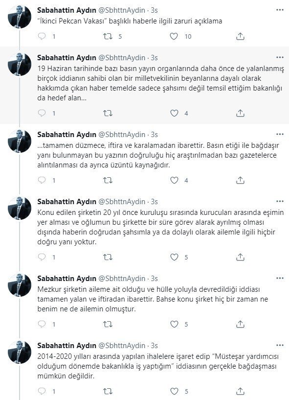 Konu edilen şirketin 20 yıl önce kuruluşu sırasında kurucuları arasında eşimin yer alması ve oğlumun bu şirkette bir süre görev alarak ayrılmış olması dışında, haberin doğrudan şahsımla ya da dolaylı olarak ailemle ilgili hiçbir doğru yanı yoktur. Mezkur şirketin aileme ait olduğu ve hülle yoluyla devredildiği iddiası tamamen yalan ve iftiradan ibarettir. Bahse konu şirket hiçbir zaman ne benim ne de ailemin olmuştur. 2014-2020 yılları arasında yapılan ihalelere işaret edip "Müsteşar yardımcısı olduğum dönemde bakanlıkla iş yaptığım" iddiasının gerçekle bağdaşması mümkün değildir. Zira herhangi bir şirketin ortağı olmadığım gibi bu tarihlerde müsteşar yardımcısı görevinde de değildim.