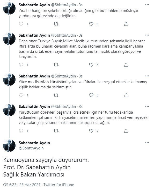 Sağlık Bakan Yardımcısı Sabahattin Aydın, "2014-2020 yılları arasında yapılan ihalelere işaret edip "Müsteşar yardımcısı olduğum dönemde bakanlıkla iş yaptığım" iddiasının gerçekle bağdaşması mümkün değildir. Zira herhangi bir şirketin ortağı olmadığım gibi bu tarihlerde müsteşar yardımcısı görevinde de değildim" dedi.