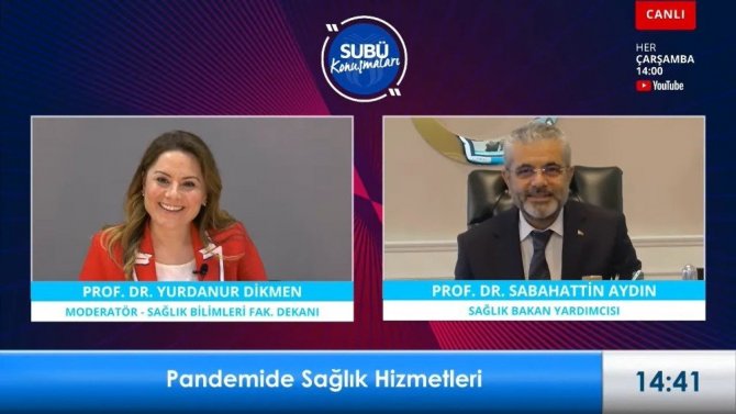 Sakarya Uygulamalı Bilimler Üniversitesi (SUBÜ) tarafından düzenlenen "SUBÜ Konuşmaları" programının 4. konuşmacısı "Pandemide Sağlık Hizmetleri" başlıklı söyleşiyle Sağlık Bakan Yardımcısı Prof. Dr. Sabahattin Aydın oldu. Üniversitenin "SUBÜ Haber" üzerinden canlı yayınlanan programın moderatörlüğünü SUBÜ Sağlık Bilimleri Fakültesi Dekanı Prof. Dr. Yurdanur Dikmen gerçekleştirdi. Söyleşide Türkiye'nin pandemi sürecinde izlediği yol haritası, filyasyon ekiplerinin önemi, yerli aşı çalışmaları ve aşılama programı konuşuldu.