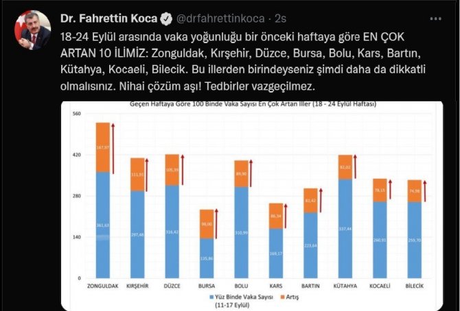 Sağlık Bakanı Fahrettin Koca sosyal medyadan yaptığı paylaşımda "Bu illerden birindeyseniz şimdi daha da dikkatli olmalısınız. Nihai çözüm aşı! Tedbirler vazgeçilmez" dedi.