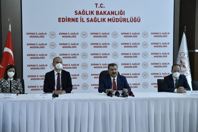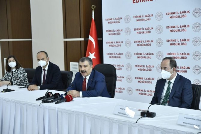 Bakan Koca, "Bugün Edirne'de Trakya Bölgesi'ndeki illerimizin durumu ile ilgili tedbirleri ve uygulamaları yerinde değerlendirme fırsatı bulduk. Toplantımıza valimiz, belediye başkanımız, rektörümüz, il sağlık yöneticilerimiz, milletvekili ve siyasi parti il başkanlarımız katıldılar. Salgın yönetiminde Edirne, Çanakkale, Kırklareli ve Tekirdağ'ın durumunu her yönü ile ele aldık" dedi.