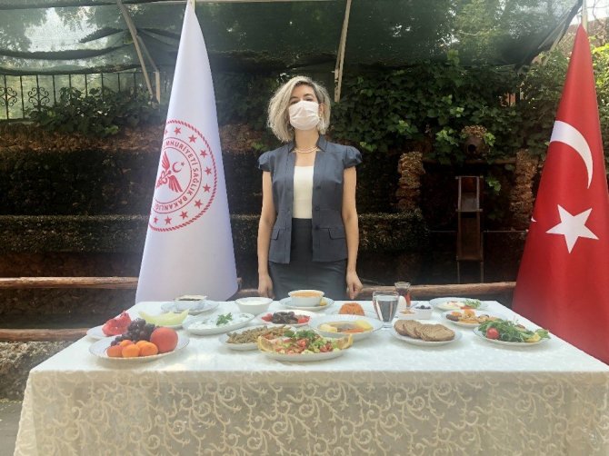 Karakaş, hazırladıkları örnek sağlıklı bayram sofrasının Sağlık Bakanlığı tarafından önerilen sağlıklı yemek tabağı modelinin genişletilmiş bir örneği olduğuna dikkat çekti. Sofrada bulunan yemek grupları hakkında konuşan Karakaş, “İki çeşit et yer alıyor, porsiyonlara uygun. El ayası kadar. Biz etleri yakmadık. Yakmadan ızgara yapmak çok önemlidir. Yandığında kömürleşme oluyor ve bu kömürleşme sürecinde de bazı kanser yapıcı ögeler oluşabiliyor. Bu sağlığımız için bir tehdittir. Yanlarına sebze koyduk. Etin yanına sebzeler olsun. Sür grubundan yoğurt ya da sebzeli yoğurt seçeneğimiz var. Tahıl grubundan çorbamız olabilir, lif açısından zengin bulgur gibi pilavlar olabilir. Bunlara yine sebze eklenebilir. Tam tahıllı, çok tahıllı ekmek seçenekleri olabilir. Bu gördüğünüz çok çeşitli, olması gereken bir ana öğün sofrasıdır” şeklinde konuştu.