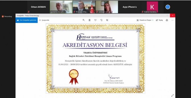 Hemşirelik Eğitim Programları Değerlendirme ve Akreditasyon Derneği tarafından çevrim içi olarak düzenlenen törene, Trakya Üniversitesi Rektörü Prof. Dr. Erhan Tabakoğlu'nun yanı sıra Rektör Yardımcısı Prof. Ahmet Hamdi Zafer, Sağlık Bilimleri Fakültesi Dekanı Prof. Dr. Sedat Üstündağ, Dekan Yardımcısı ve Hemşirelik Bölümü Başkanı Prof. Dr. Özgül Erol ile HEPDAK Yönetim Kurulu Başkanı Prof. Dr. Gülseren Kocaman, HEPDAK Yönetim Kurulu üyeleri, Hemşirelik Bölümü öğretim üyeleri ve öğrenciler katıldı.