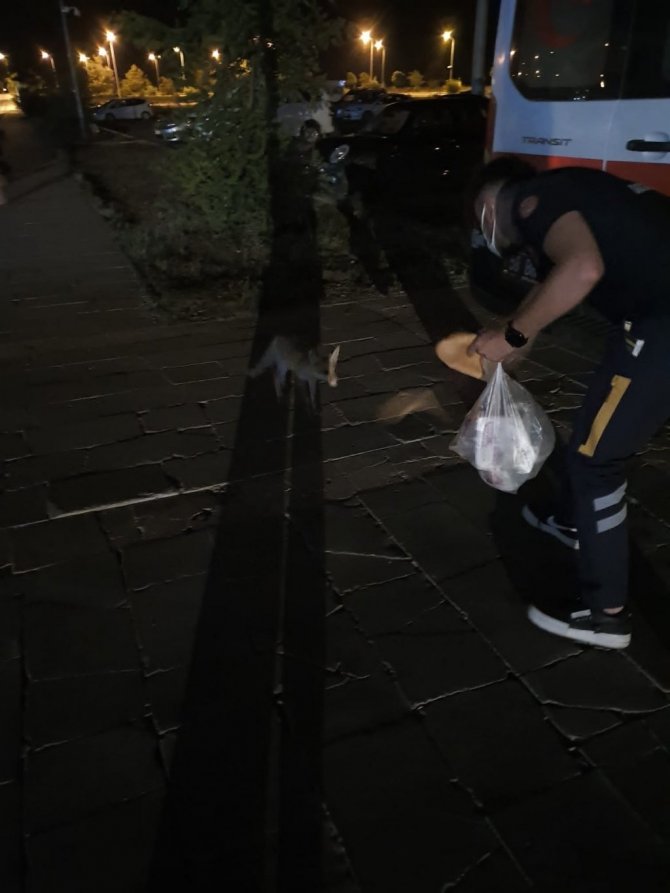 Sivas'ta görev yağan birkaç Acil Tıp Teknisyenleri aç olan tilkiyi elleriyle besledi, o anlar cep telefonu kamerasına yansıdı.