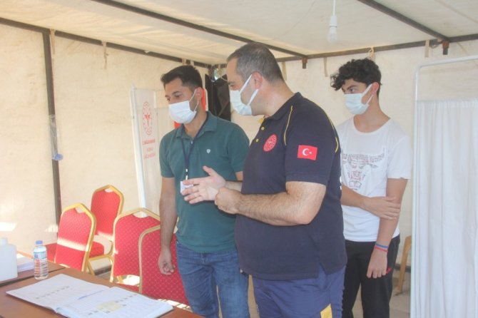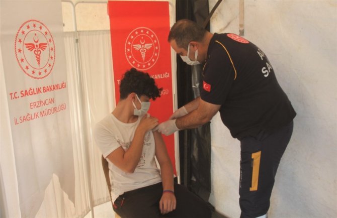 Korona virüs salgınıyla etkin bir mücadelenin sergilendiği Erzincan'da aşılama çalışmaları tüm hızıyla devam ediyor. İl Sağlık Müdürlüğü tarafından kentin farklı noktalarına kurulan mobil aşı merkezlerinde aşı hakkı tanımlanmış vatandaşlara randevusuz korona virüs (Covid-19) aşısı yapılırken Erzincan'ın en işlek caddelerinden olan Ordu Caddesi üzerinde kurulan mobil aşı çadırında Erzincan İl Sağlık Müdürü Erkan Hirik, aşı hakkı tanımlanan 16 yaşında ki oğlu Gün Hirik'e 1. doz aşısını kendi elleriyle yaparak vatandaşlara aşılanma çağrısında bulundu. Tüm halkın önünde kendi çocuğuna kendi elleriyle aşı yapan İl Sağlık Müdürü Hirik korkulacak veya tereddüt edilecek hiçbir şeyin olmadığını göstermek istiyor.