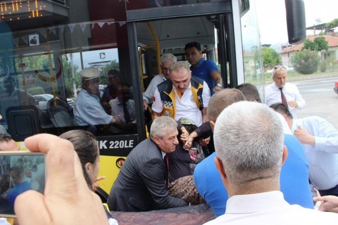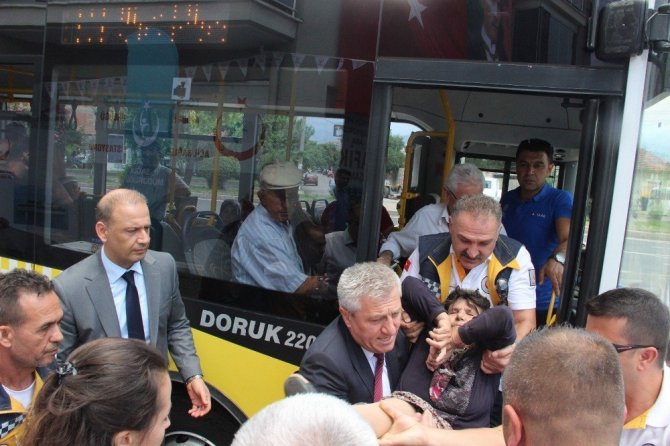 Açılış için orada bulunan Aydın İl Sağlık Müdürü Dr. Fevzi Yavuzyılmaz da, hasta kadına ilk müdahaleyi yapan ekip içerisinde yer aldı. Otobüs içinde yaşlı kadına ilk müdahaleyi yapan Müdür Yavuzyılmaz, kadını kucaklayıp sedyeye taşıdı. Ambulans görevlileri tarafından Sevgi Çevik, Atatürk Devlet Hastanesi ‘ne kaldırıldı. Müşahede altına alınan hasta kadının durumunun ise iyi olduğu öğrenildi.