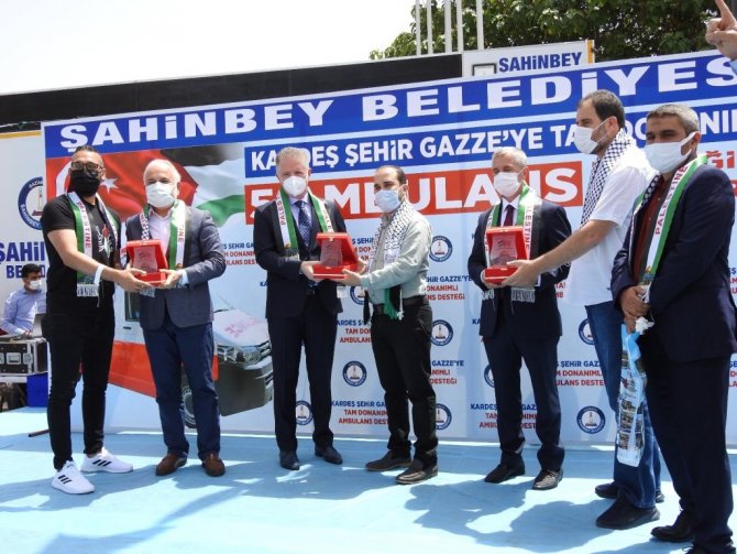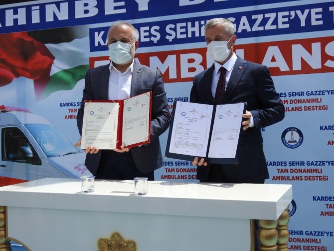 Şahinbey Belediyesi, Filistin'in Gazze şehrine tam donanımlı 5 ambulans destek protokolü, Türk Kızılay Genel Başkanı Kerem Kınık ve Şahinbey Belediye Başkanı Mehmet Tahmazoğlu'nun imza töreniyle gerçekleştirildi. Protokol sonrası Filistinli turistler Tahmazoğlu ve Kınık'a hediyeler vererek, teşekkür etti.