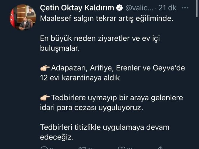 Sakarya'da son dönemde aile, akraba ve arkadaş buluşmaları sebebiyle vakalar ve karantinalar arttı. Bu gelişme üzerine Sakarya Valisi Çetin Oktay Kaldırım, sosyal medya hesabı üzerinden açıklama yaptı. Şehirde son olarak Adapazarı, Arifiye, Erenler ve Geyve ilçelerinde 12 evin karantinaya alındığını belirten Vali Kaldırım, "Maalesef salgın tekrar artış eğiliminde. En büyük neden ziyaretler ve ev içi buluşmalar. Adapazarı, Arifiye, Erenler ve Geyve'de 12 evi karantinaya aldık. Tedbirlere uymayıp bir araya gelenlere idari para cezası uyguluyoruz. Tedbirleri titizlikle uygulamaya devam edeceğiz" ifadelerini kullandı.